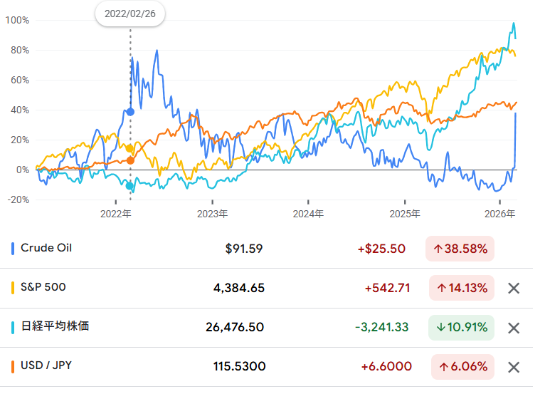 原油、S&P500、日経平均、ドル円の5年推移。2025年まで強かった資産がそのまま勝ち続けるとは限らず、相場が荒れる局面では「何を買うか」より「どう守るか」が重要になります。