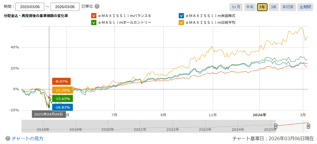 実際に、2025年3月6日を起点にした1年比較チャートを見ると、その特徴はかなりはっきり出ています。2025年4月9日、いわゆるトランプ関税ショックの局面では、eMAXIS Slim バランス(8資産均等型)は起点比で約マイナス8.07%でした。