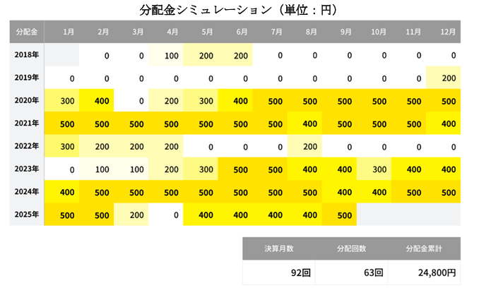※分配金累計24,800円を、これまでの決算回数92回で割ると1回あたり約269円。