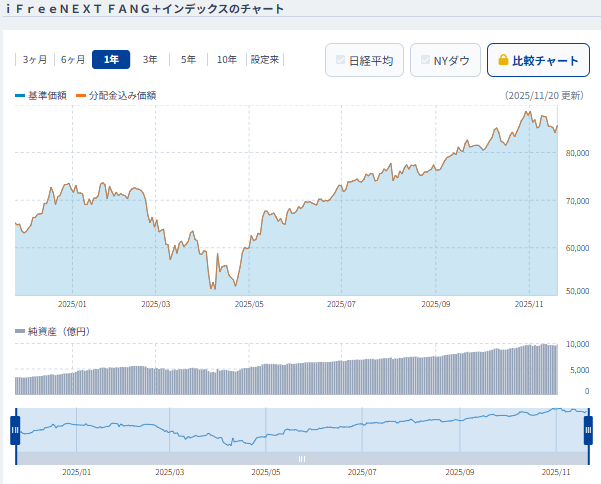 ※以下のチャートは「毎月分配型そのもの」ではなく、現行のiFreeNEXT FANG+インデックスの値動き を使っています。→ 性質が近いため参考として掲載。