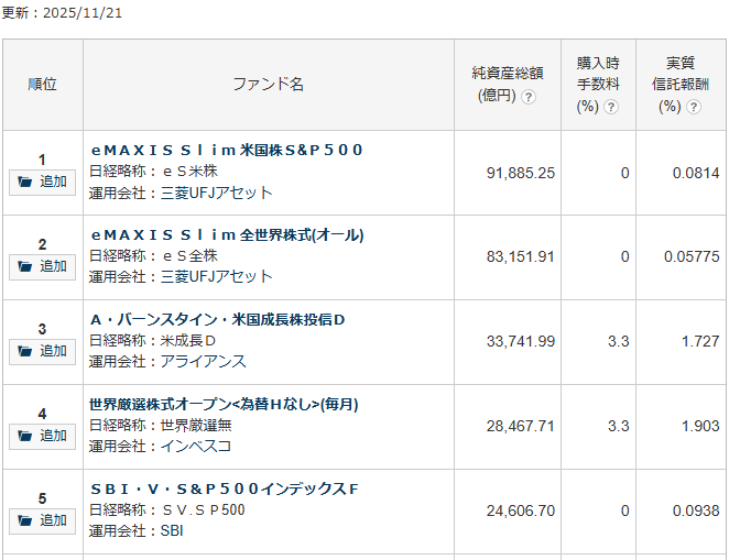 こうした背景から、毎月分配型は急速に再評価が進んでいます。実際、国内で販売されている投資信託の純資産ランキングを見ると、上位5銘柄のうち3位と4位に毎月分配型ファンドがランクイン しており、人気の高さが数字にも表れています。
