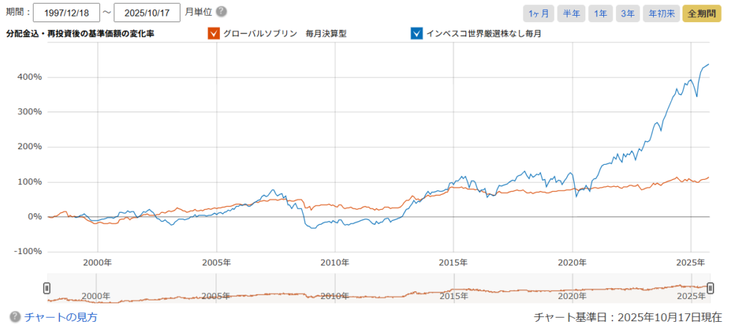 チャートを見ると、2010年代後半まで両者のリターンは比較的近い水準で推移していました。しかし、2020年を境に、両者の道は劇的に分かれます。 「世界のベスト」が急角度で上昇していく一方、「グロソブ」は横ばい、もしくは緩やかな下落トレンドを辿ります。