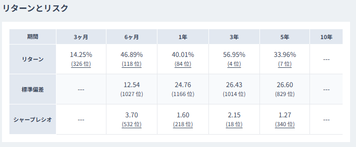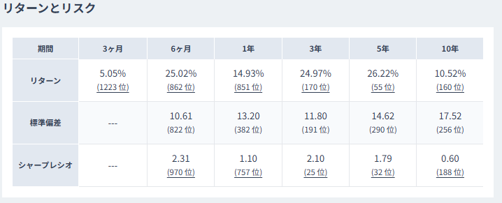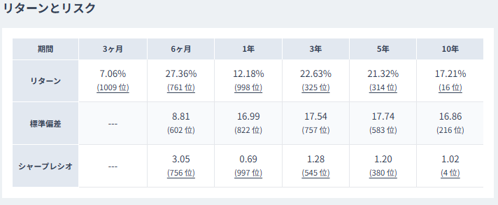 この表を見ると、3年・5年といった中長期でも年率20%前後のリターンを維持しており、利回りが20%弱であれば、分配金を支えるだけの運用リターンが十分に確保されていることがわかります。