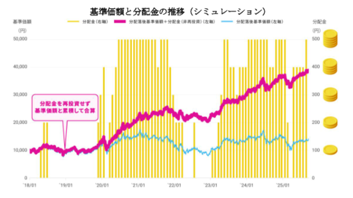 たとえキャピタルゲインを取りこぼしたとしても、毎月確実に現金が入ってくる安心感は非常に大きいです。投資経験や投資額に関係なく、購入したその日から “同じ分配金利回り” を享受できる点は、これから投資を始める方にとっても大きな支えになるでしょう。