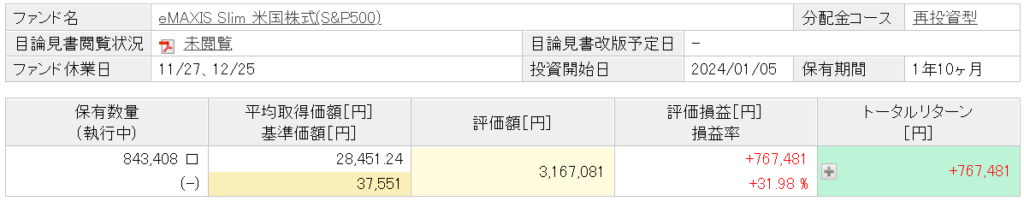 1年10ヶ月で+53.9%。S&P500の強さを体感できた一年でした。