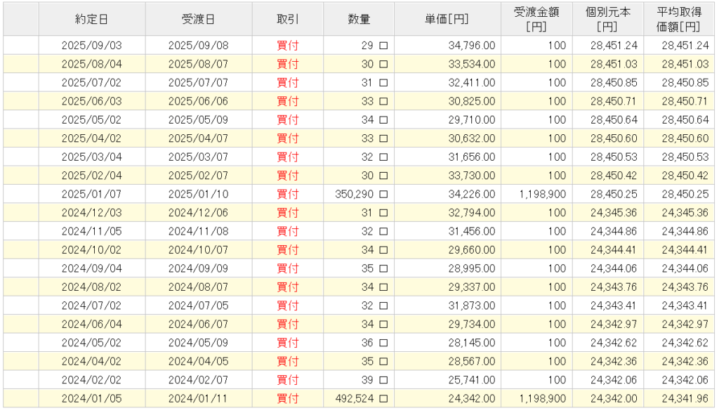 2024年と2025年では購入できた口数(=取得量)に大きな差があり、株価が着実に成長している様子がはっきりと分かります。