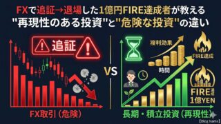 投資戦略 FXで追証→退場した1億円FIRE達成者が教える「再現性のある投資」と「危険な投資」の違い 2011年の東日本大震災でFXの追証により退場した筆者が、なぜレバレッジ投資が危険なのかを実体験で解説。長期インデックス投資×自社株の長期保有で約13年かけて1億円超のFIREを達成した「再現性のある投資」の考え方と実践法を公開。 2024.08.18 2026.04.03 投資戦略